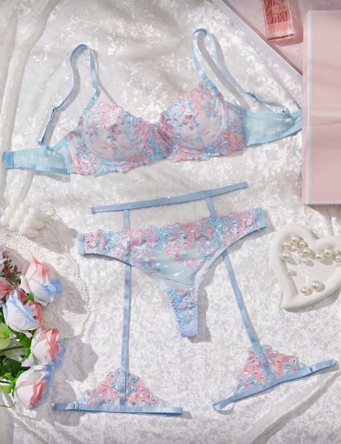 Sutiã sem bojo, calcinha fio duplo e cinta liga.