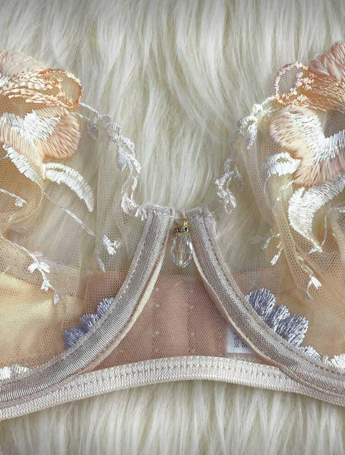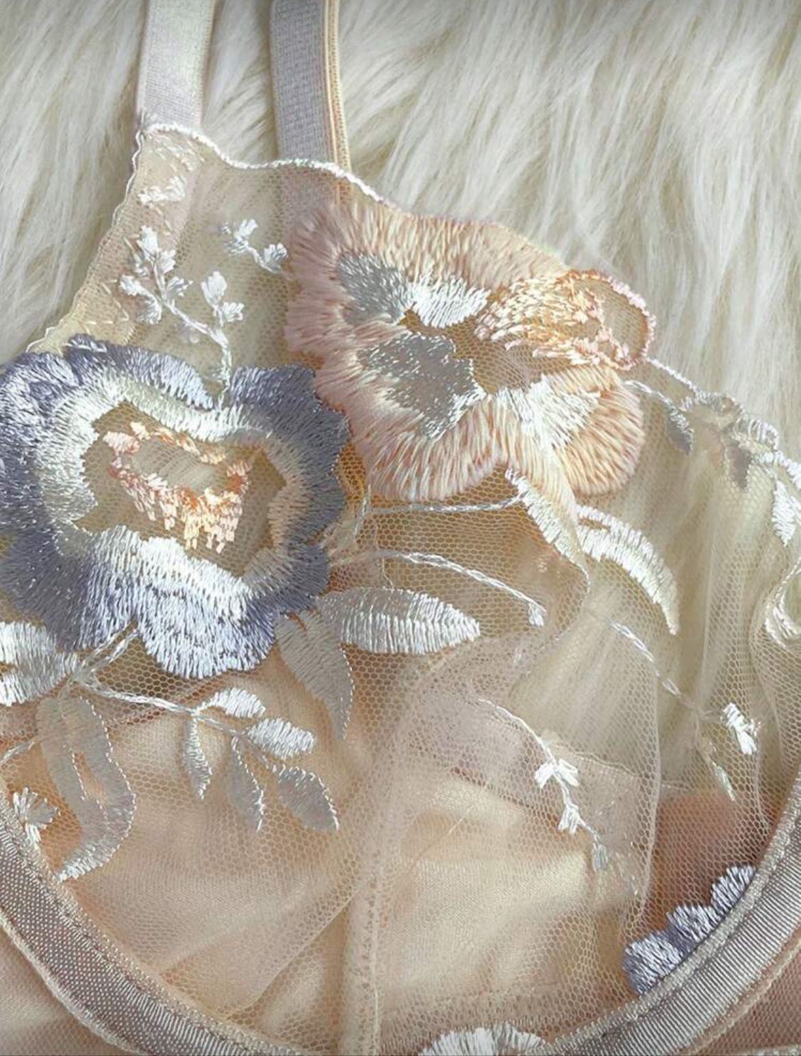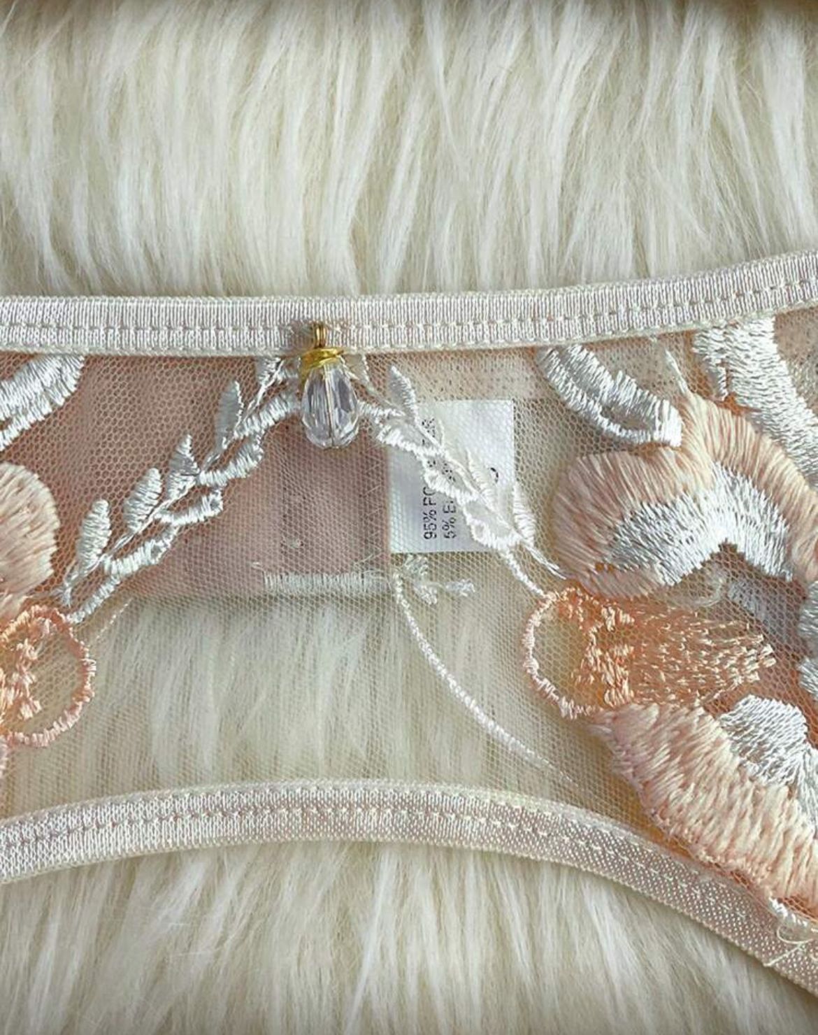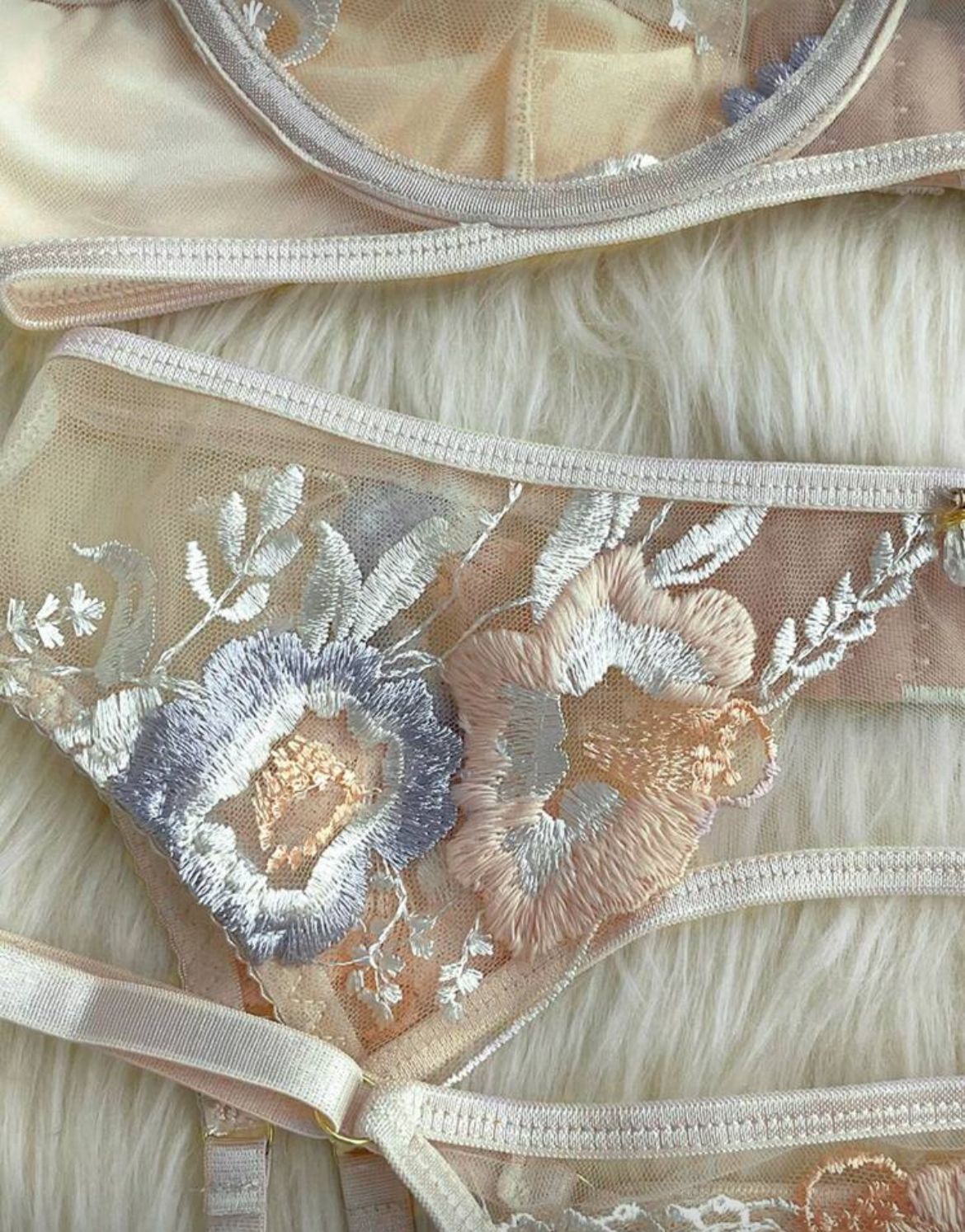Sutiã sem bojo com aro, calcinha fio duplo e cinta liga.