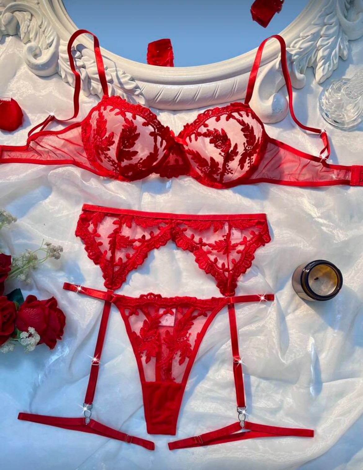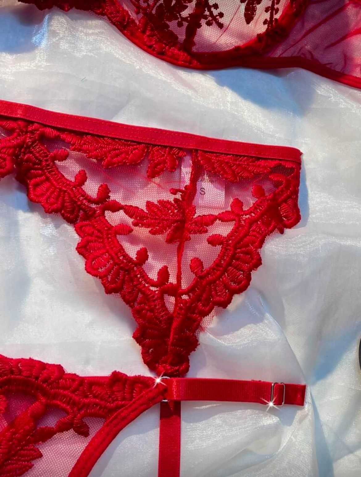 Seja o primeiro a avaliar “Conjunto com cinta liga vermelho com tule rendado- M”
