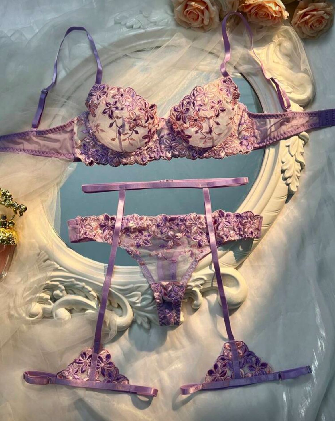 CONJUNTO EM RENDA E TULE. SUTIÃ SEM BOJO COM ARO, CALCINHA FIO DUPLO E CINTA LIGA.