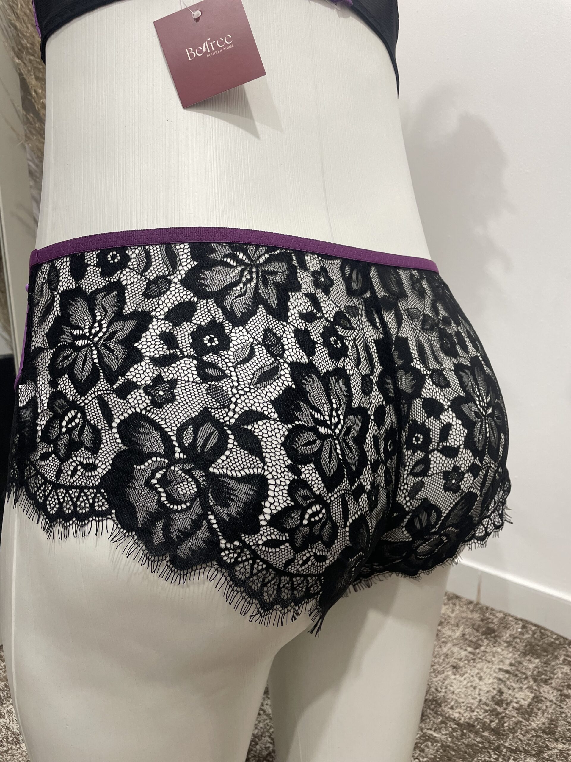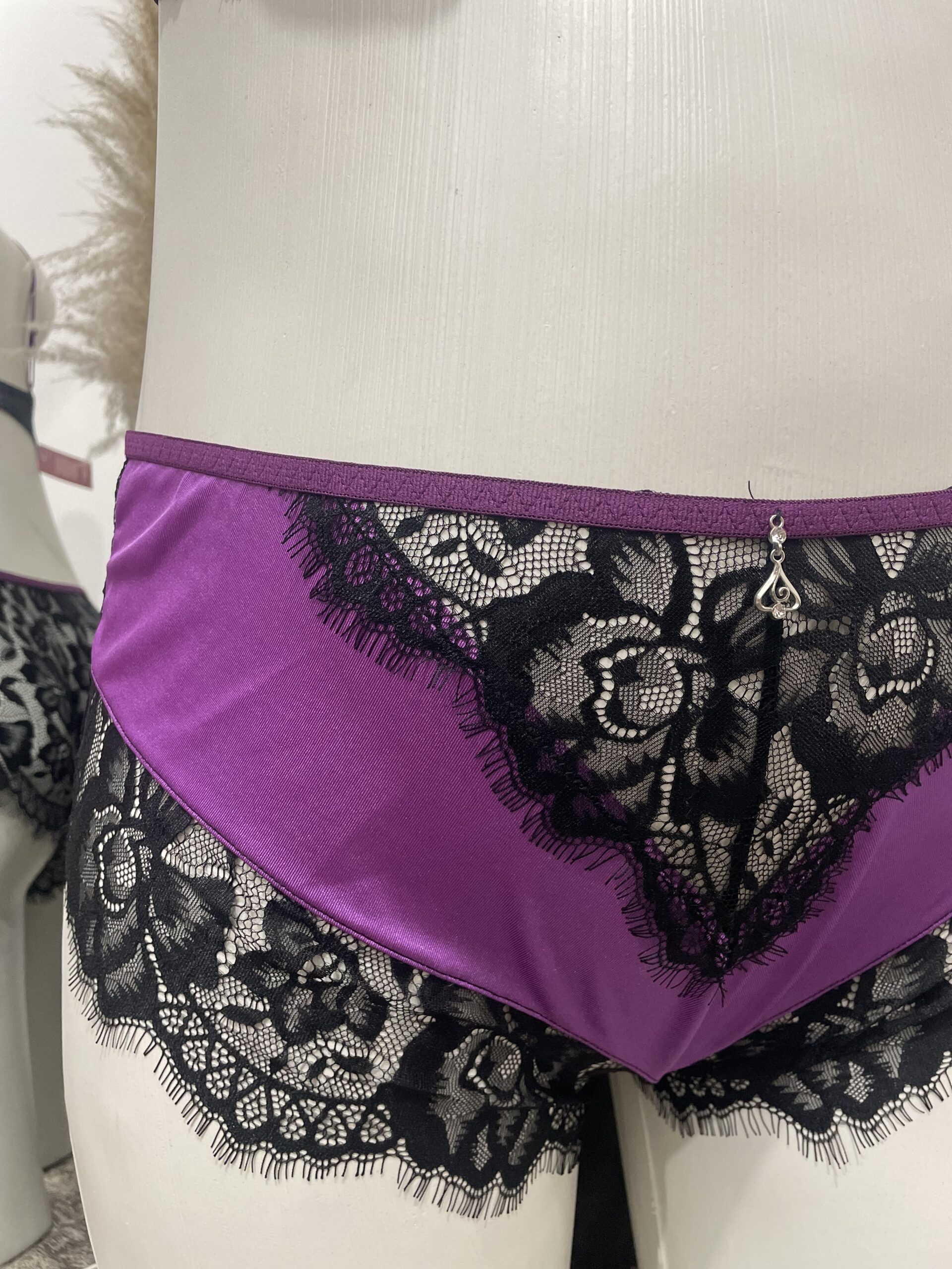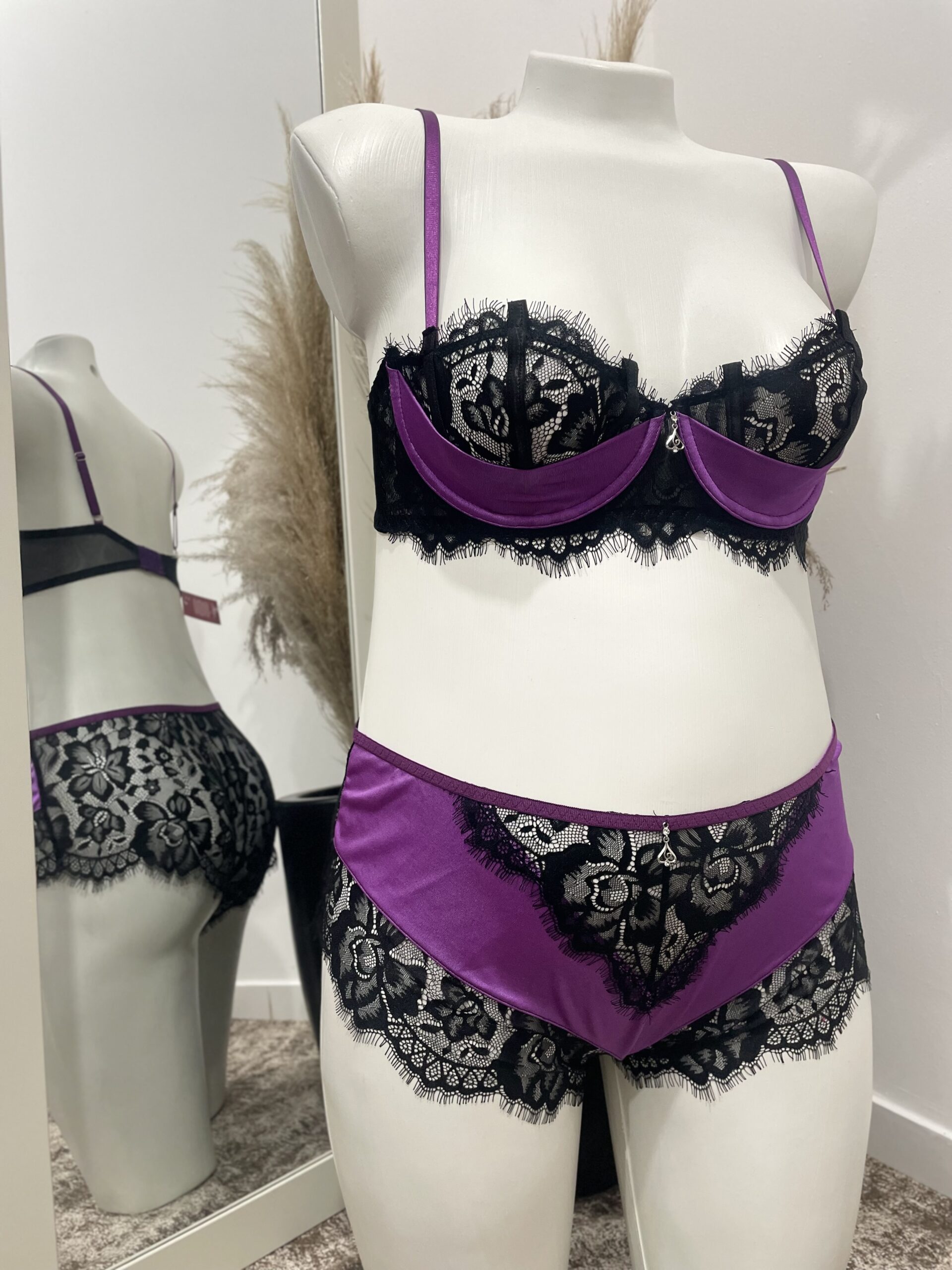 Conjunto lingerie em renda e tecido acetinado. Sutiã sem bojo e calcinha hot pants, cós alto.