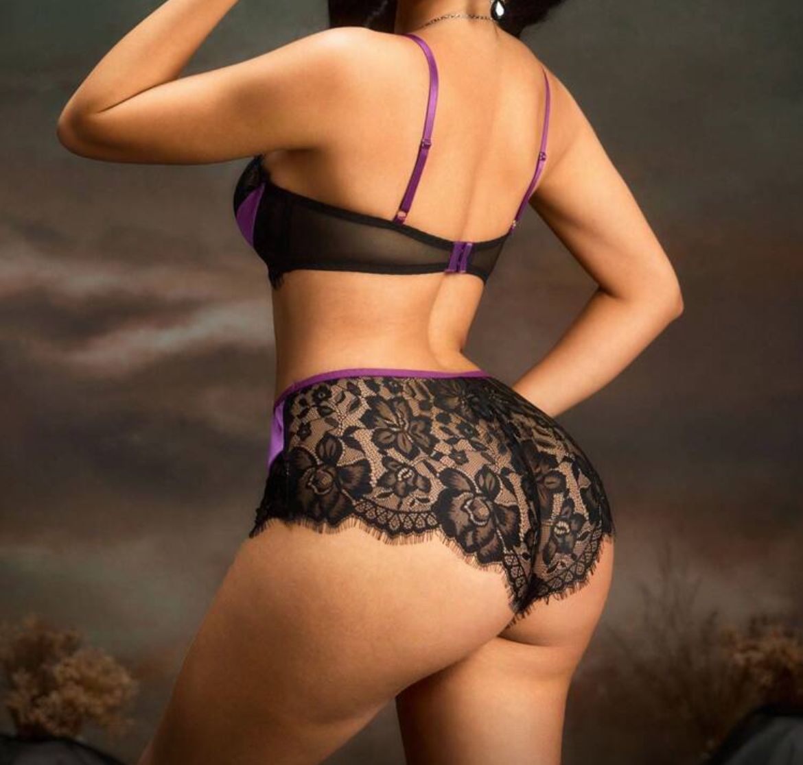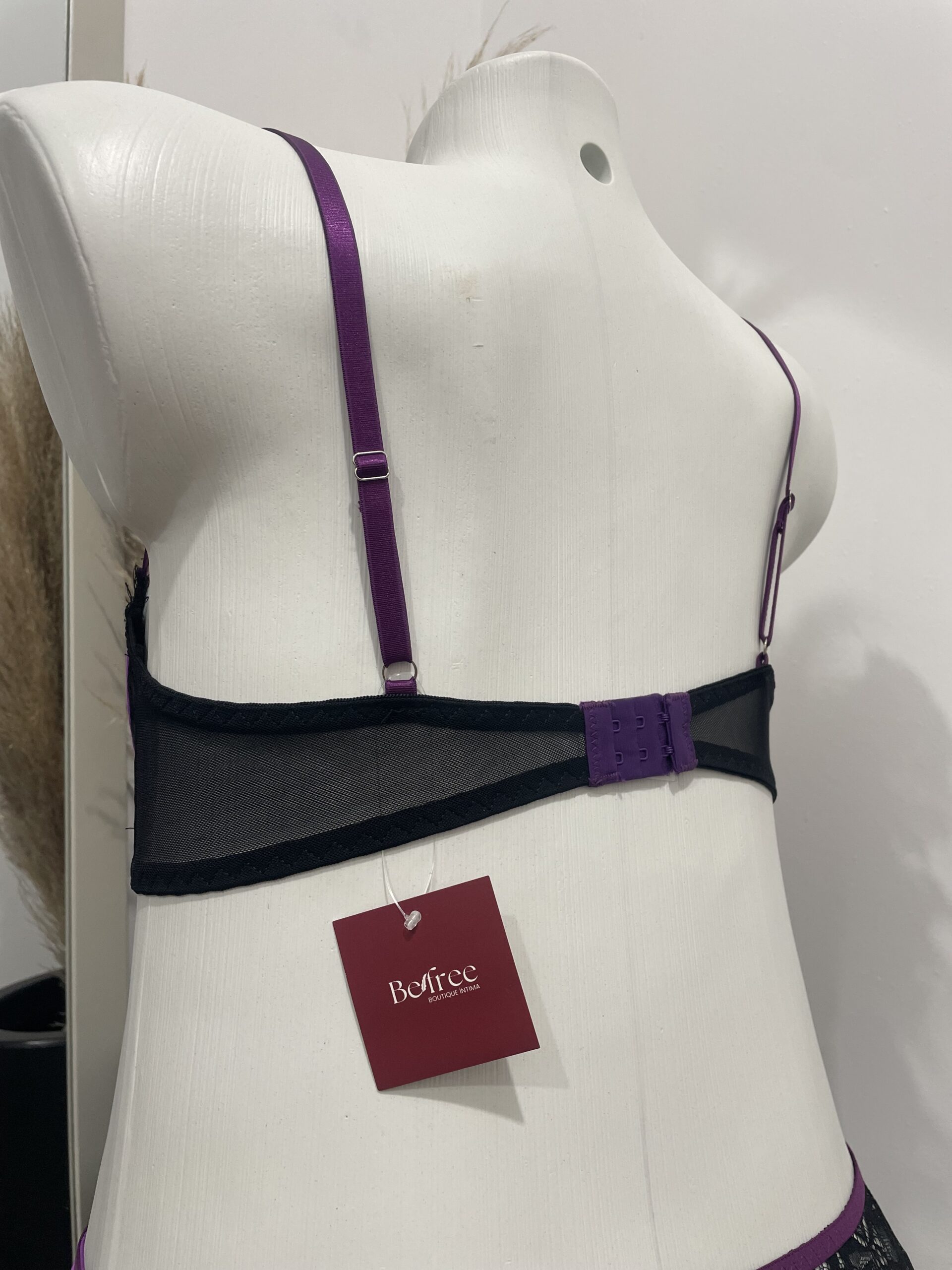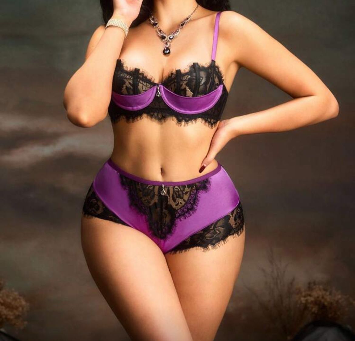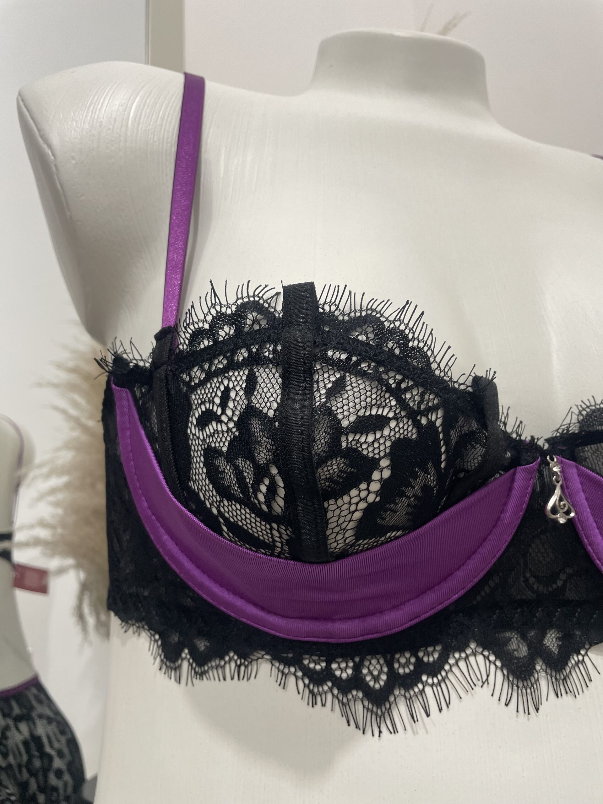 Conjunto lingerie em renda e tecido acetinado. Sutiã sem bojo e calcinha hot pants, cós alto.